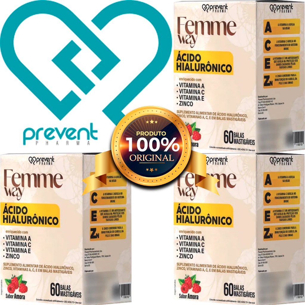 O Ácido Hialurônico + Vitaminas A, C, E + Zinco Femmeway 60 Balas, da Prevent Pharma, é um suplemento alimentar em formato de balas mastigáveis, desenvolvido especialmente para promover a saúde da pele, fortalecer o sistema imunológico e contribuir para o bem-estar geral. Com sabor agradável de amora, esse produto combina ativos essenciais para quem busca beleza e vitalidade de dentro para fora.