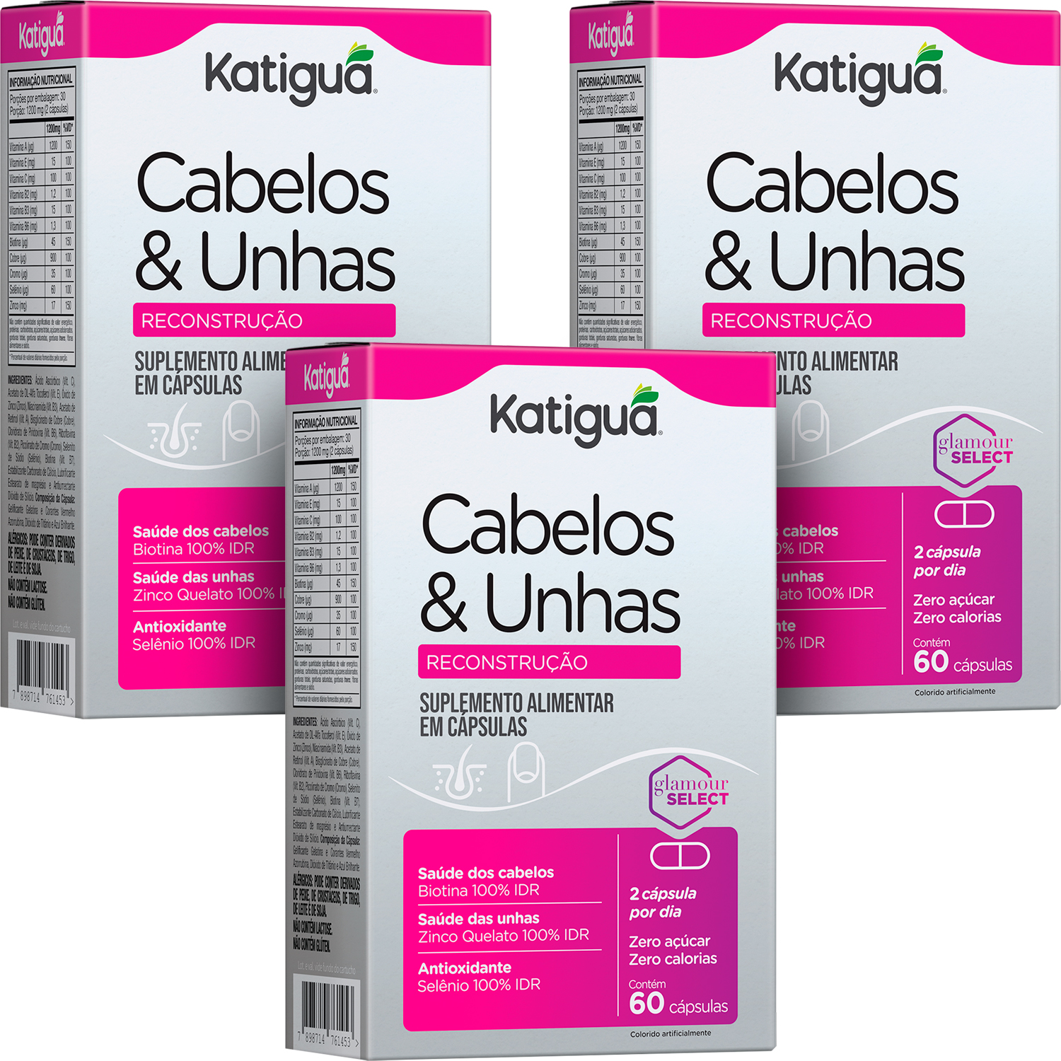 O suplemento Cabelos e Unhas Reconstrução da Katiguá é formulado para fortalecer e revitalizar cabelos e unhas, promovendo crescimento saudável, resistência e brilho. Cada embalagem contém 60 cápsulas, desenvolvidas com uma combinação de vitaminas, minerais e nutrientes essenciais que atuam de forma sinérgica na reconstrução da estrutura capilar e na melhora da firmeza das unhas.