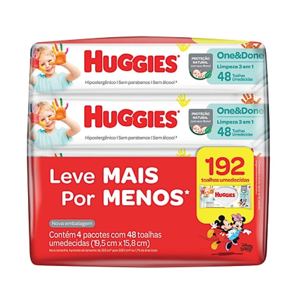 As toalhas umedecidas Huggies One&Done são ideais para recém nascido pois foram elaboradas com ingredientes suaves como água e algodão, para limpar cuidadosamente. Além de ajudar a prevenir assaduras, garantindo proteção e segurança à pele sensível do bebê desde o seu nascimento. Fórmula 99% água e extratos naturais. Quantidade: 192 unidades.